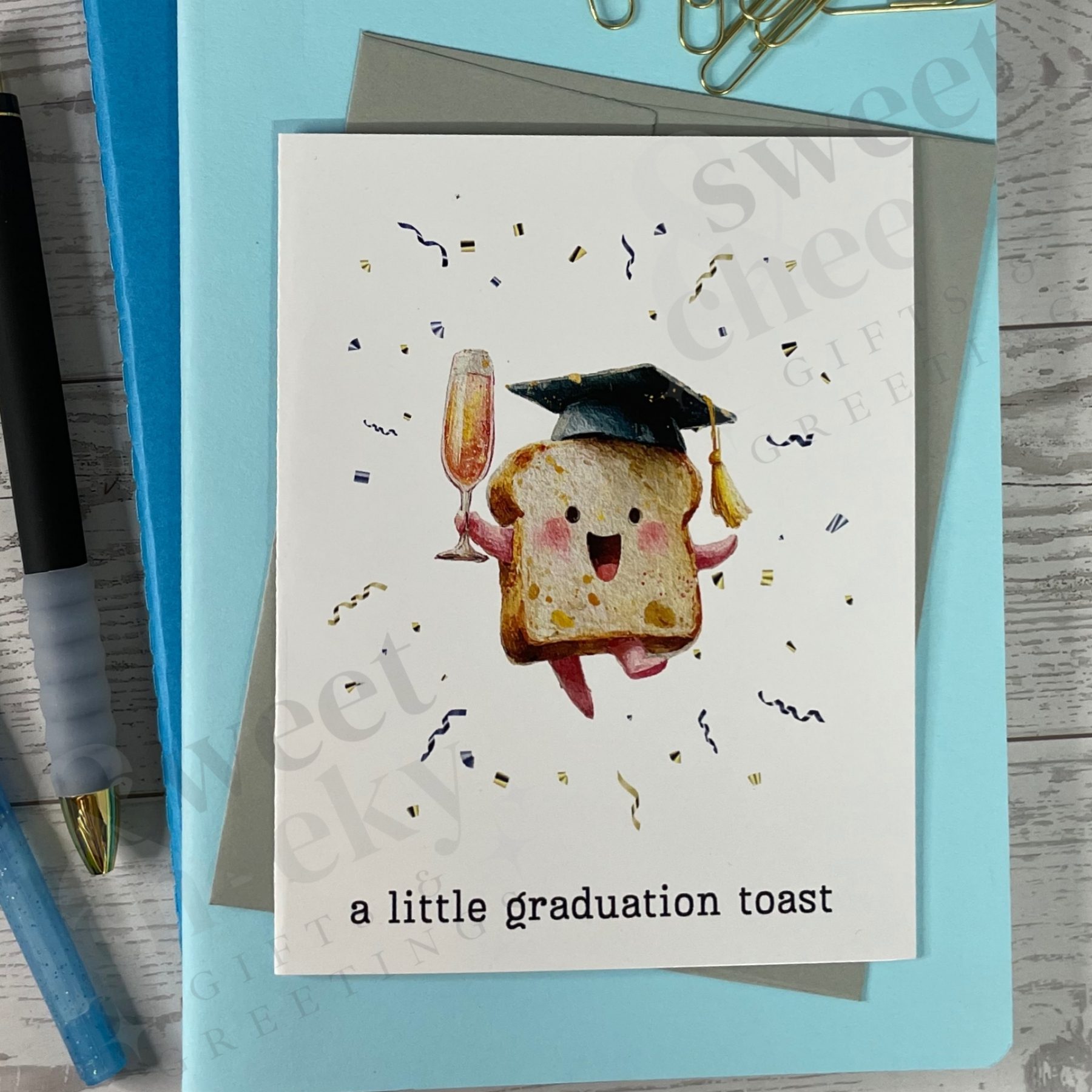 Here’s to late nights, hard work, and the sweet taste of success! This cheerful little slice of toast raises a glass of bubbly to celebrate the big achievement. Fun, lighthearted, and full of personality, it’s the perfect way to say “congrats, you did it!” with a wink and a smile. Ideal for grads of all ages who deserve a little celebration.
