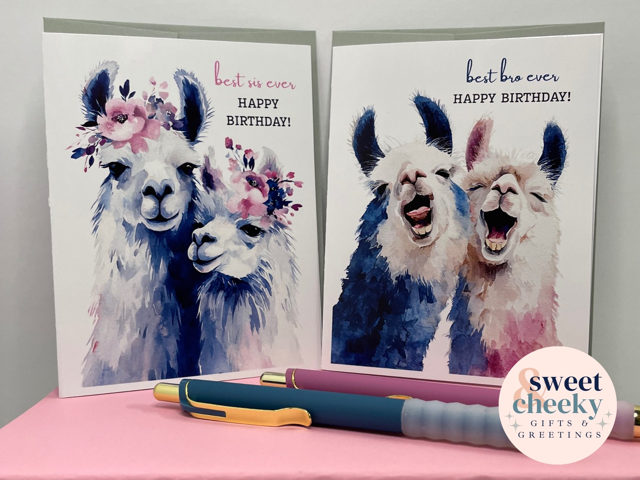 Two llamas, one big birthday vibe! This playful card features a pair of adorable llama siblings—one pink and one in neutral tones—ready to celebrate the best brother ever. Lighthearted and full of charm, it’s a fun way to say happy birthday with a mix of sweetness and silly llama personality. Perfect for brothers of any age who appreciate a good laugh and a great card.