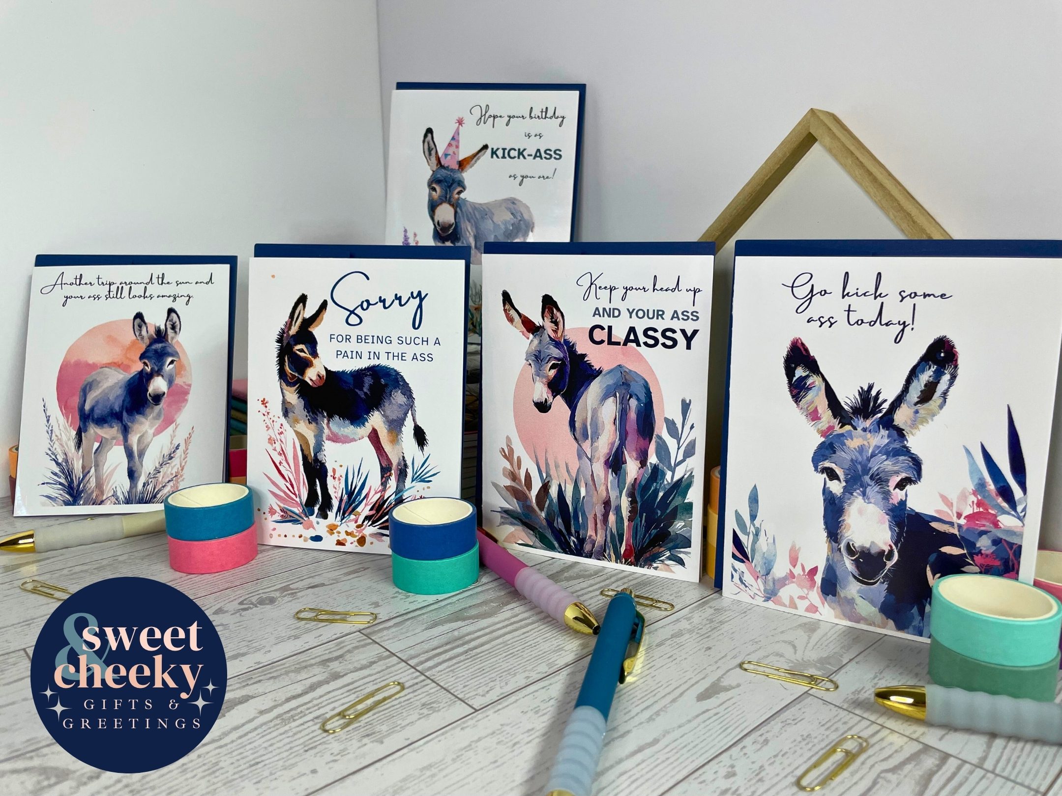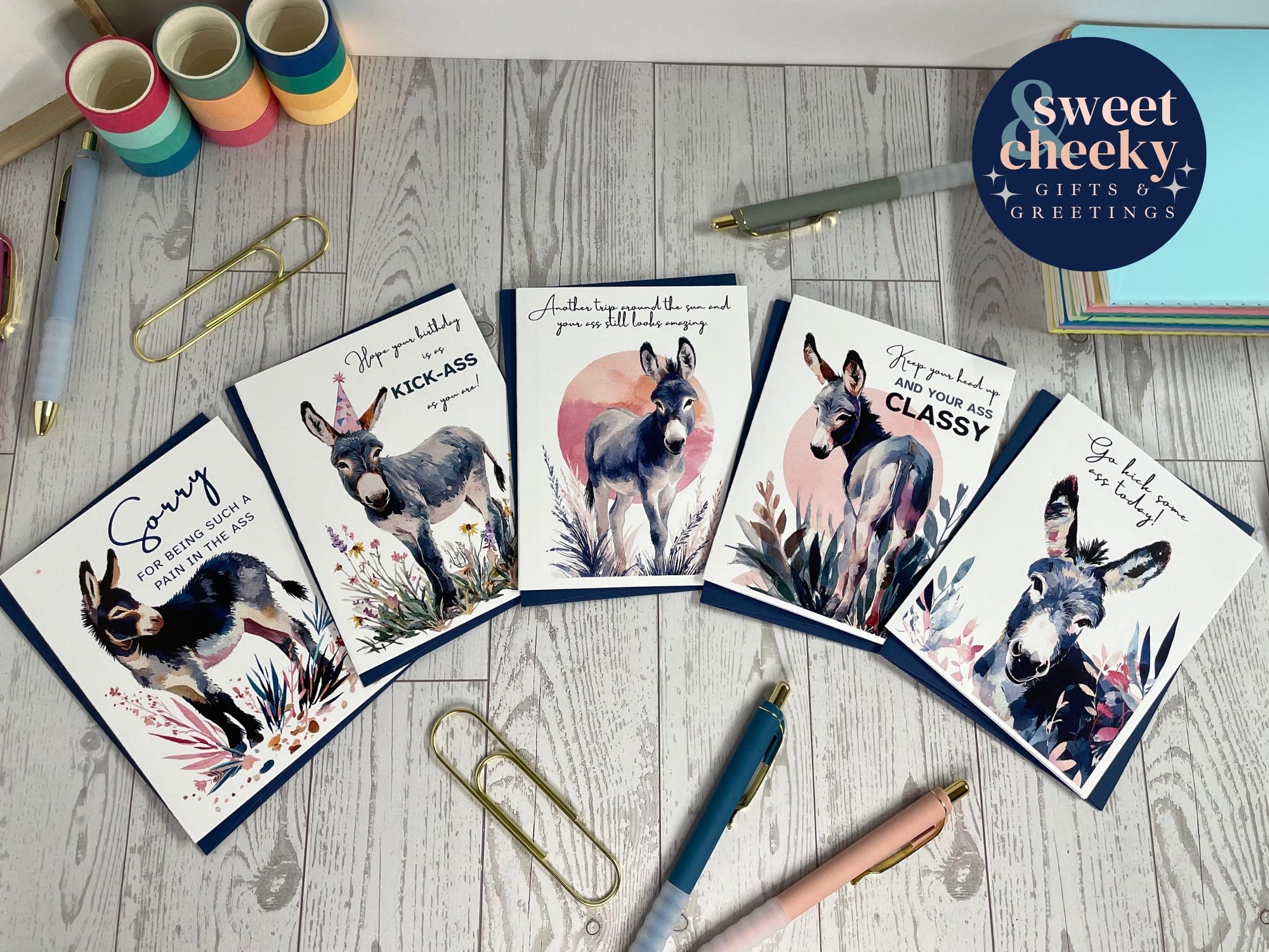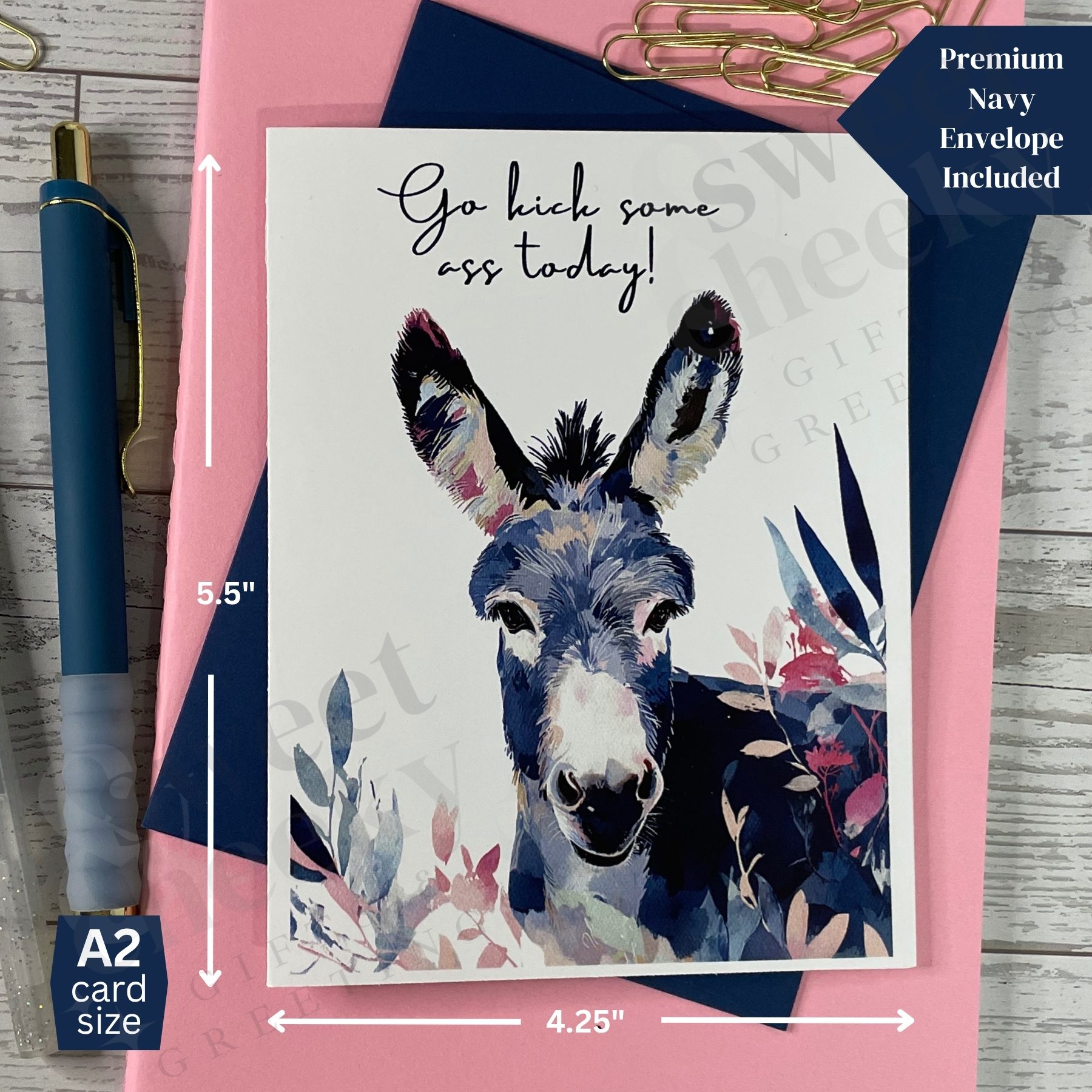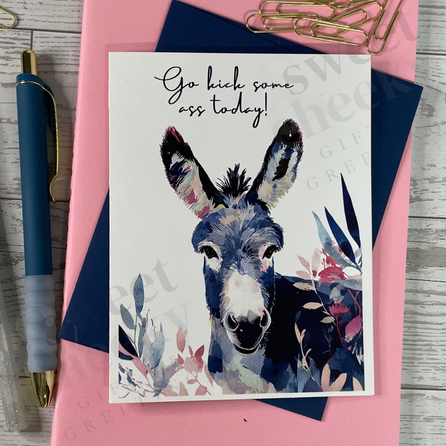 Motivation with a mischievous grin. This cheeky greeting card stars a confident watercolor donkey and the bold message: “Go kick some ass today.” Whether they’re facing a big day, a new job, or just need a little extra pep in their step, this card delivers the perfect mix of encouragement and sass. Because sometimes, the best way to say “you’ve got this” is with a little attitude.