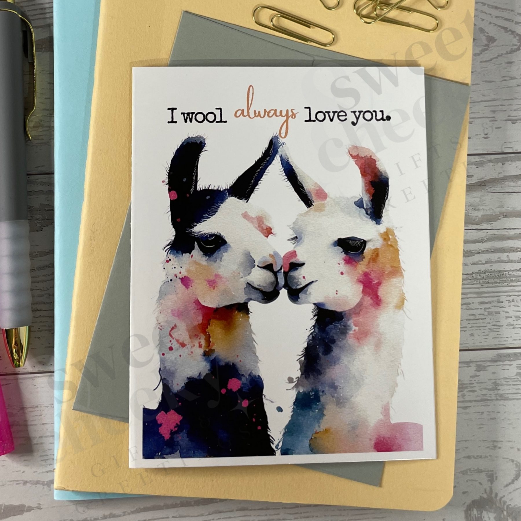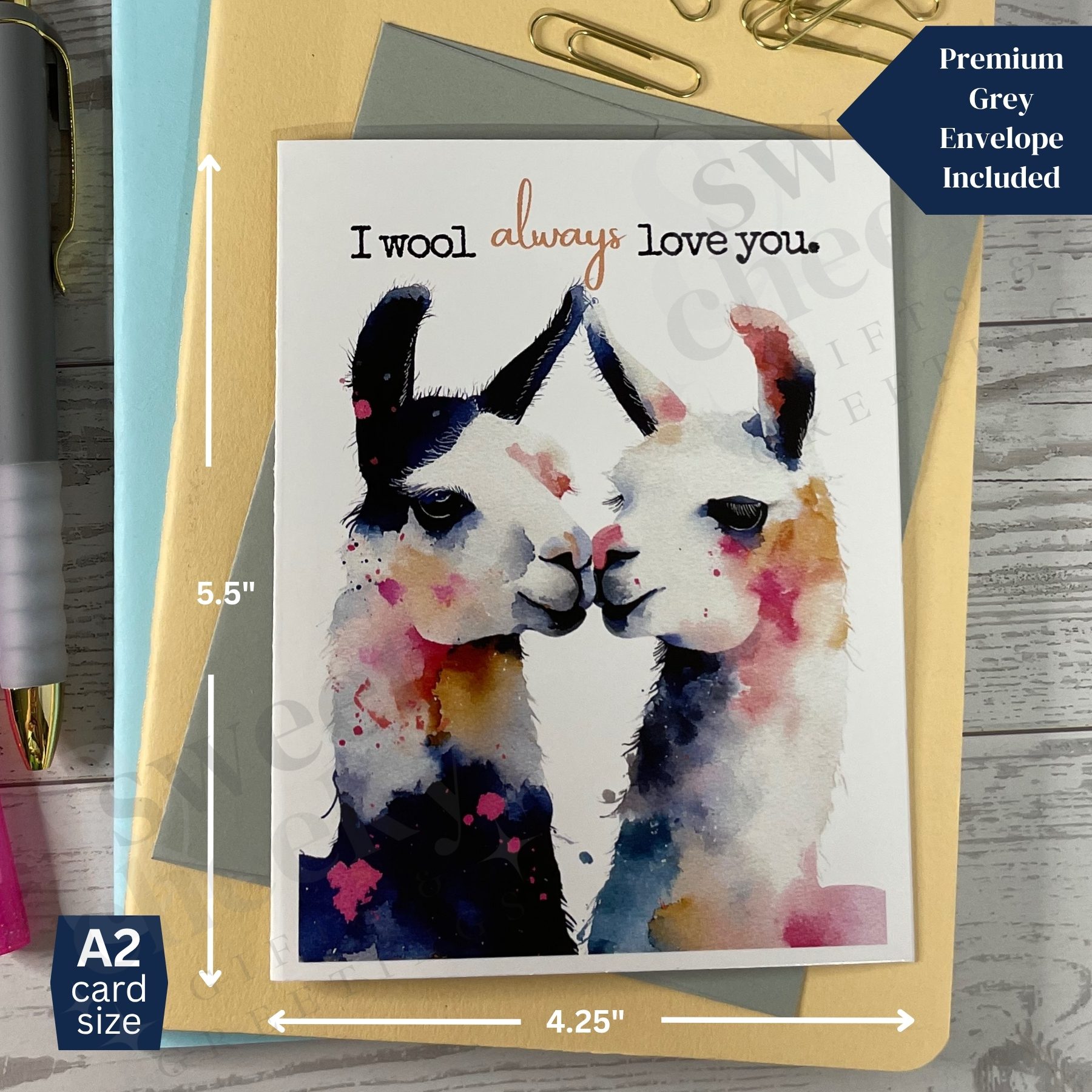 Soft, snuggly, and full of punny affection. This adorable greeting card features two watercolor alpacas cozying up with the playful message: “I wool always love you.” Perfectly punny and irresistibly sweet, it’s a fun way to say “I love you” with a little fuzz and flair. Ideal for anniversaries, Valentine’s Day, or just because you’re feeling lovey and a little bit silly.