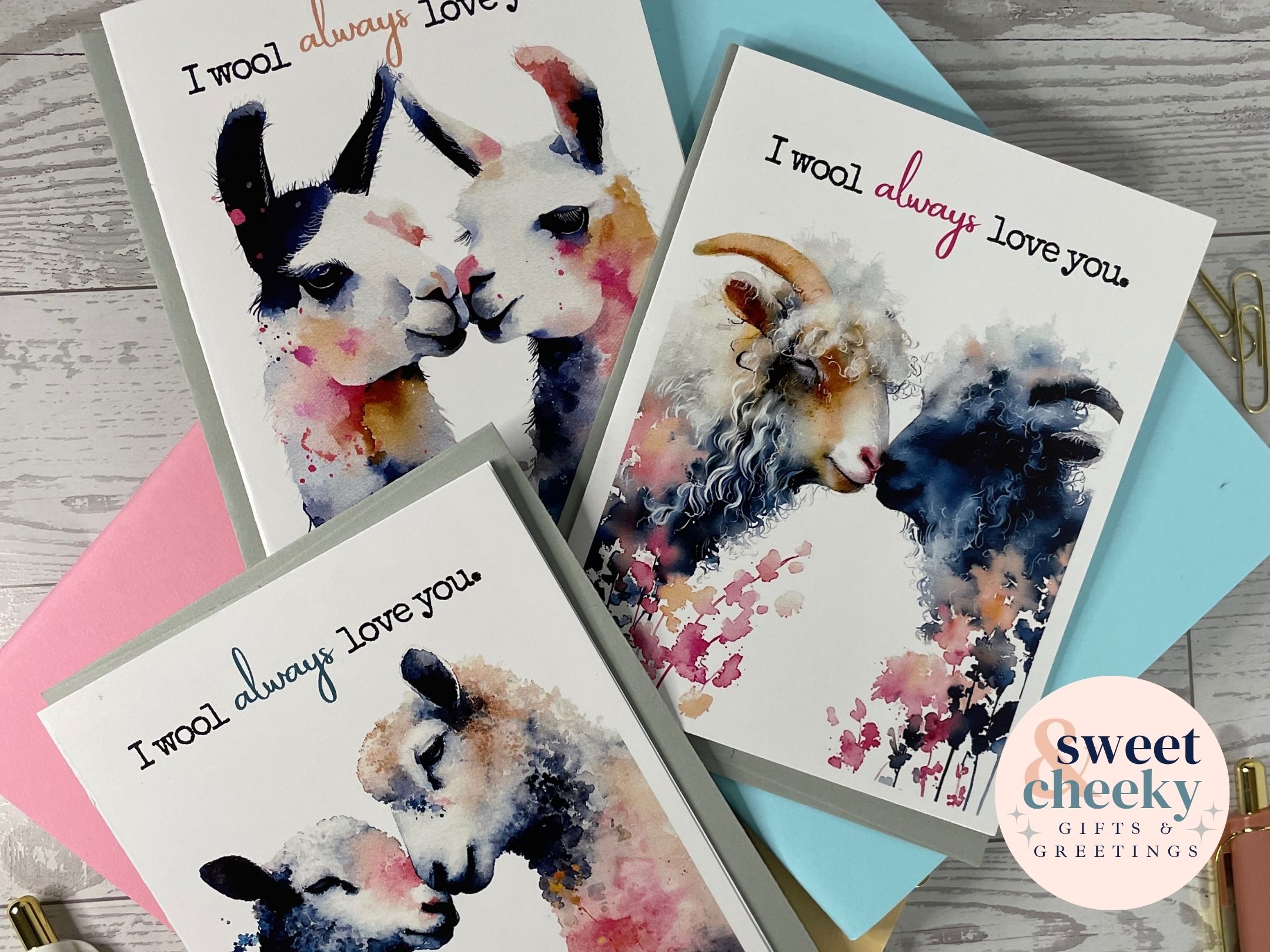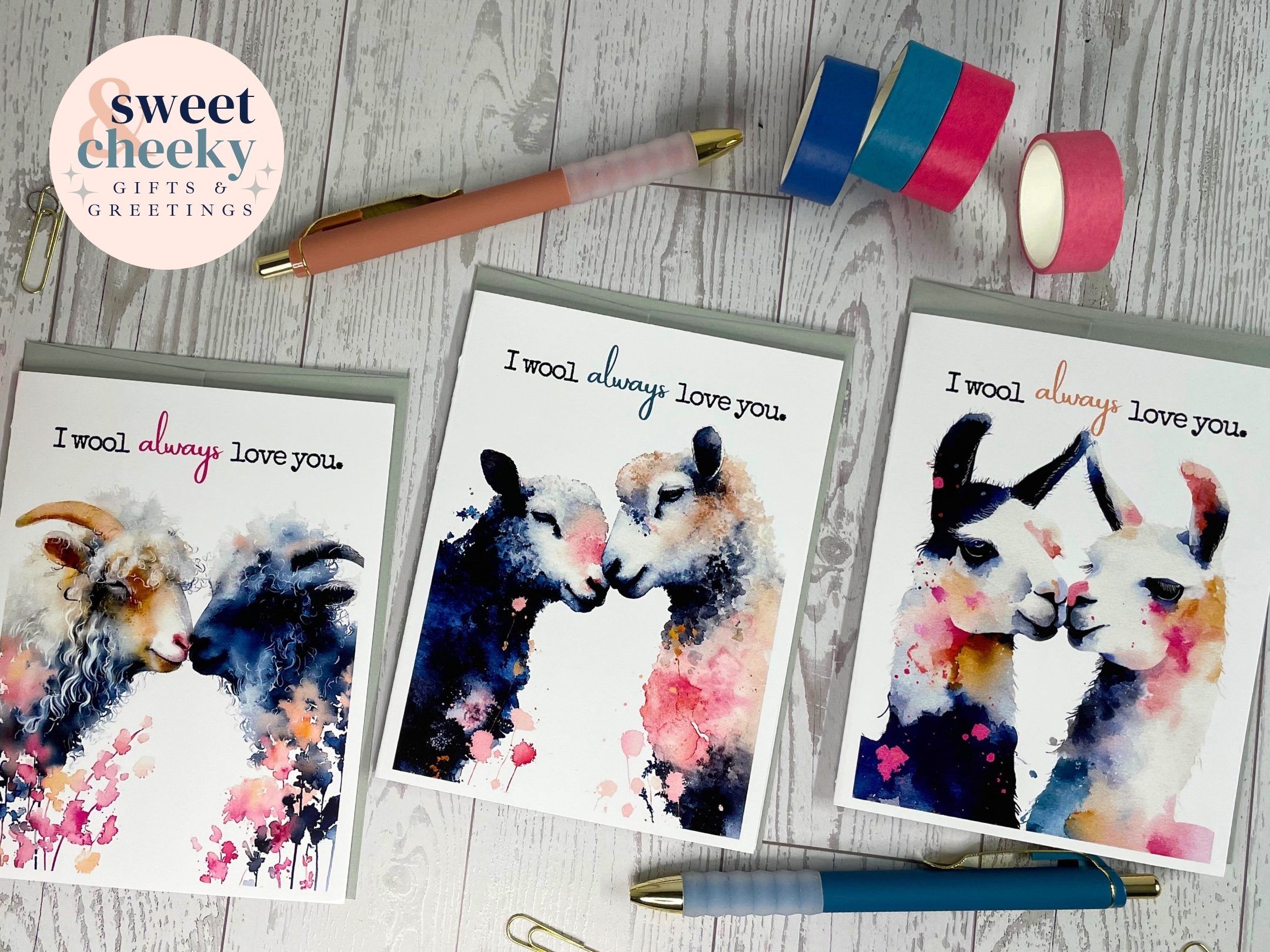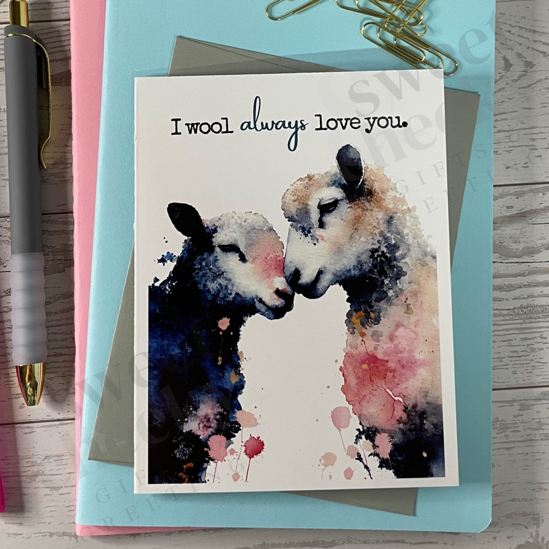 Cuddly, charming, and full of heartfelt humor. This adorable greeting card features two fluffy watercolor sheep snuggled together beneath the playful message: “I wool always love you.” Soft, simple, and sweetly punny, it’s the perfect way to say “I love ewe” — with a wink and a smile. Ideal for anniversaries, Valentine’s Day, or any time you want to remind someone special that your love is shear perfection. 🐑💕