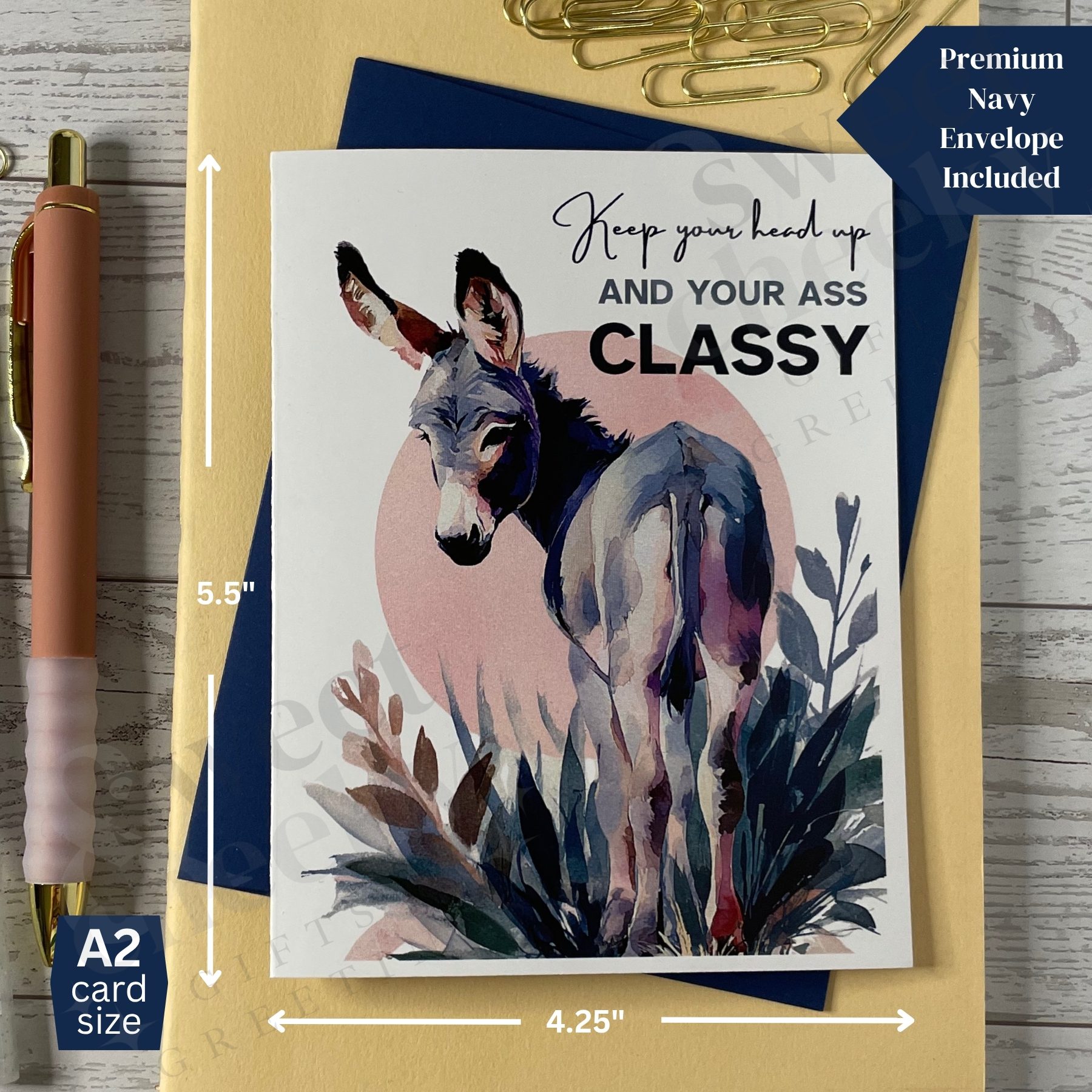 When life gets messy, stay classy—ass classy. This hilarious donkey greeting card delivers a dose of encouragement with attitude. Featuring a charming watercolor donkey and the witty message: “Keep your head up, ass classy,” it’s the perfect pick-me-up for friends who need a laugh, a little motivation, or both. Ideal for tough days, new adventures, or just reminding someone they’ve got this (and they look good doing it).