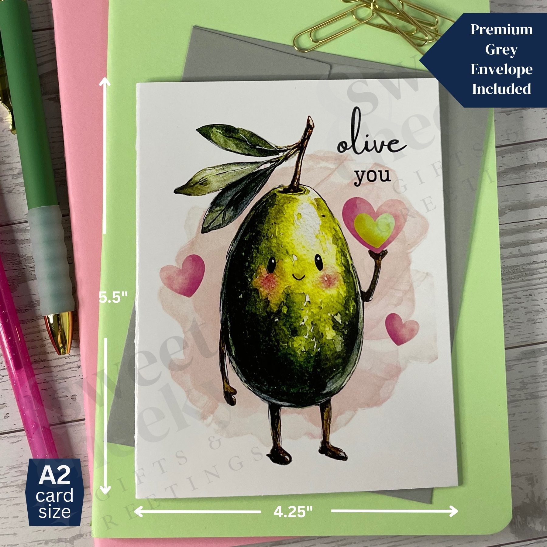 Simple, sweet, and adorably punny! This charming love card features a happy little olive—stick arms, stick legs, big heart—and the playful message “Olive you.” Perfect for Valentine’s Day, anniversaries, or any day you want to send a tiny burst of affection. Cute enough to melt hearts, light enough to keep things fun. A deliciously lovable way to say “I love you” without overthinking it.