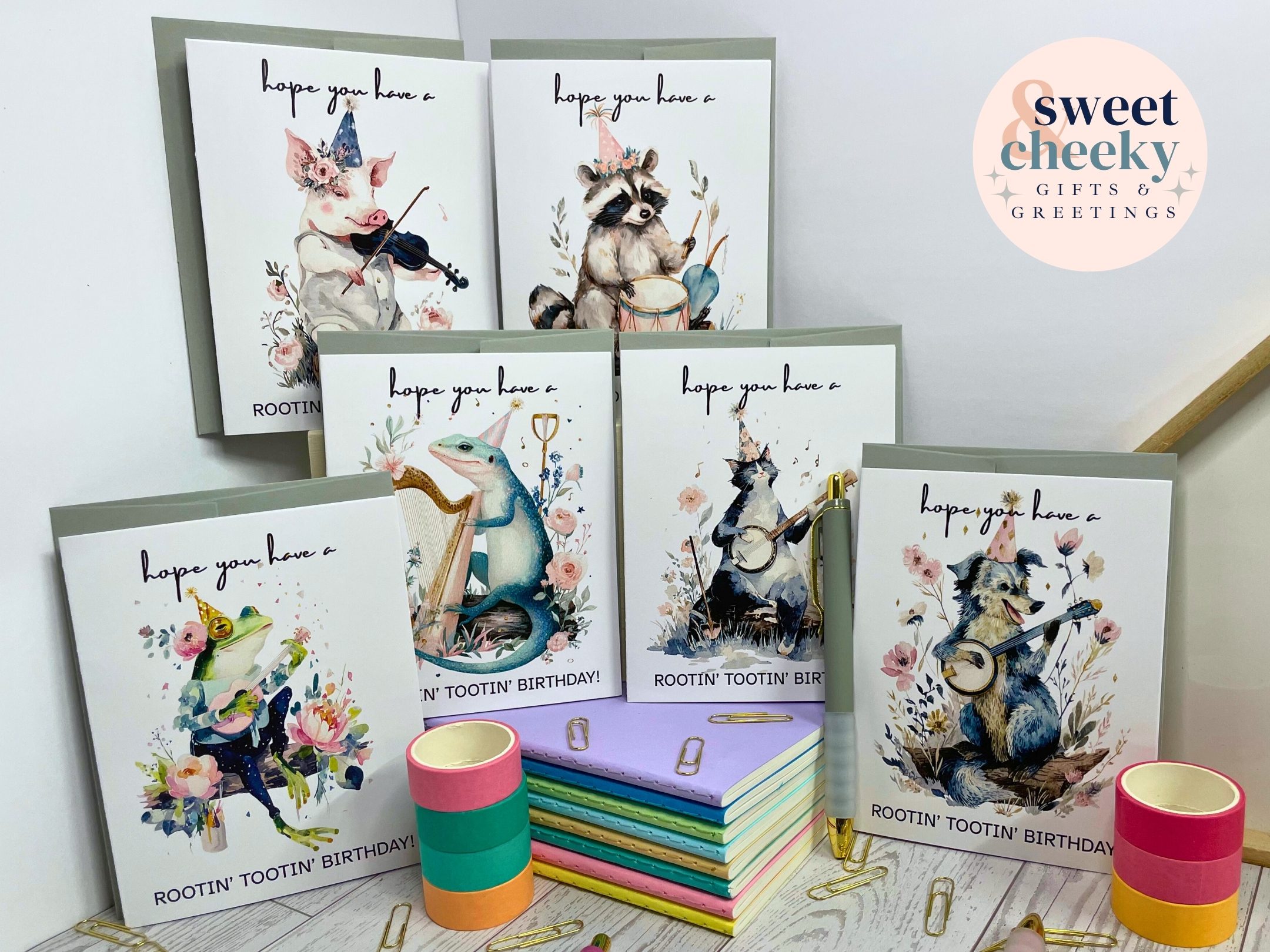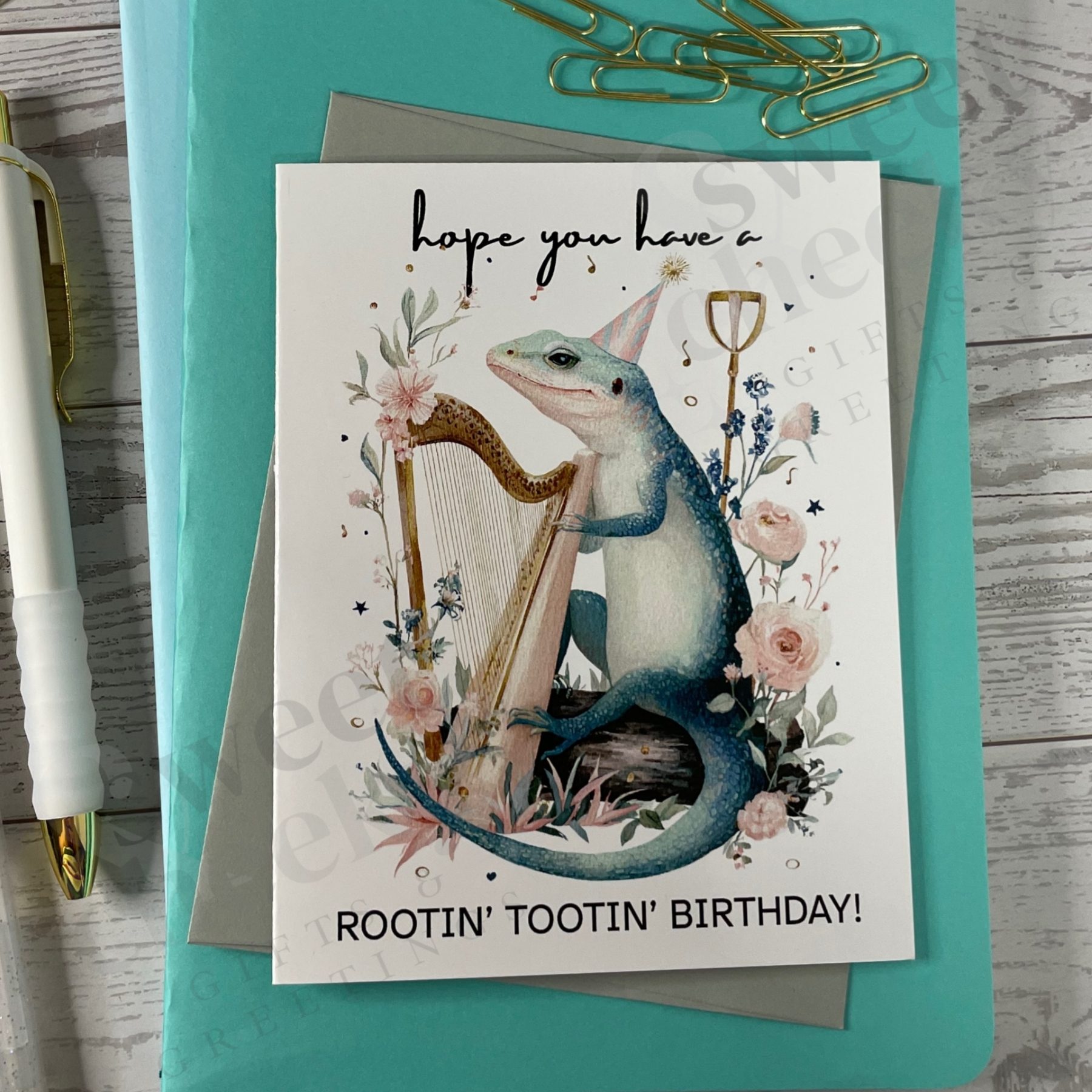 This one’s plucked straight from the wild west! Featuring a delightfully quirky illustration of a country lizard strumming a harp, this card hits all the right notes for a birthday full of charm and cheer. With the playful message: “Have a rootin’ tootin’ birthday,” it’s the perfect mix of western whimsy and reptile flair—ideal for anyone who loves a good tune, a good laugh, and a good time.