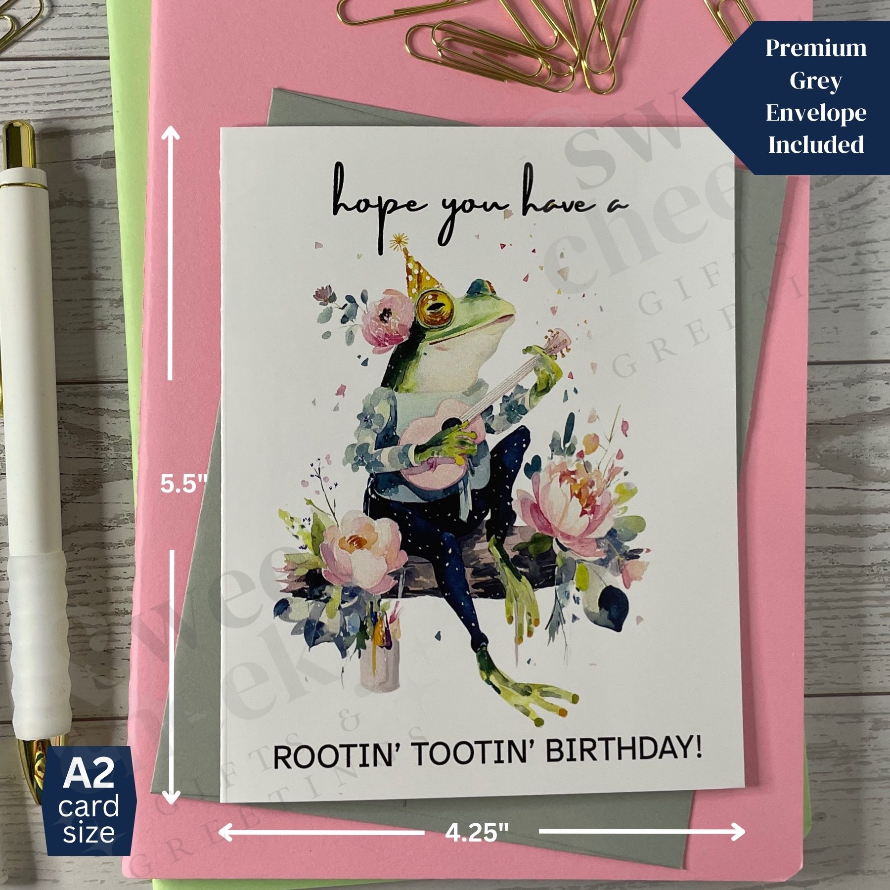 Send some toe-tappin’, banjo-strummin’ birthday joy with this delightfully quirky card. Featuring a charming watercolor illustration of a frog playing a banjo, this card delivers country-style cheer with the playful message: “Have a rootin’ tootin’ birthday.” Perfect for anyone who appreciates a little whimsy, a lot of personality, and a touch of southern flair. Fun, lighthearted, and totally unique—just like the person you’re sending it to.