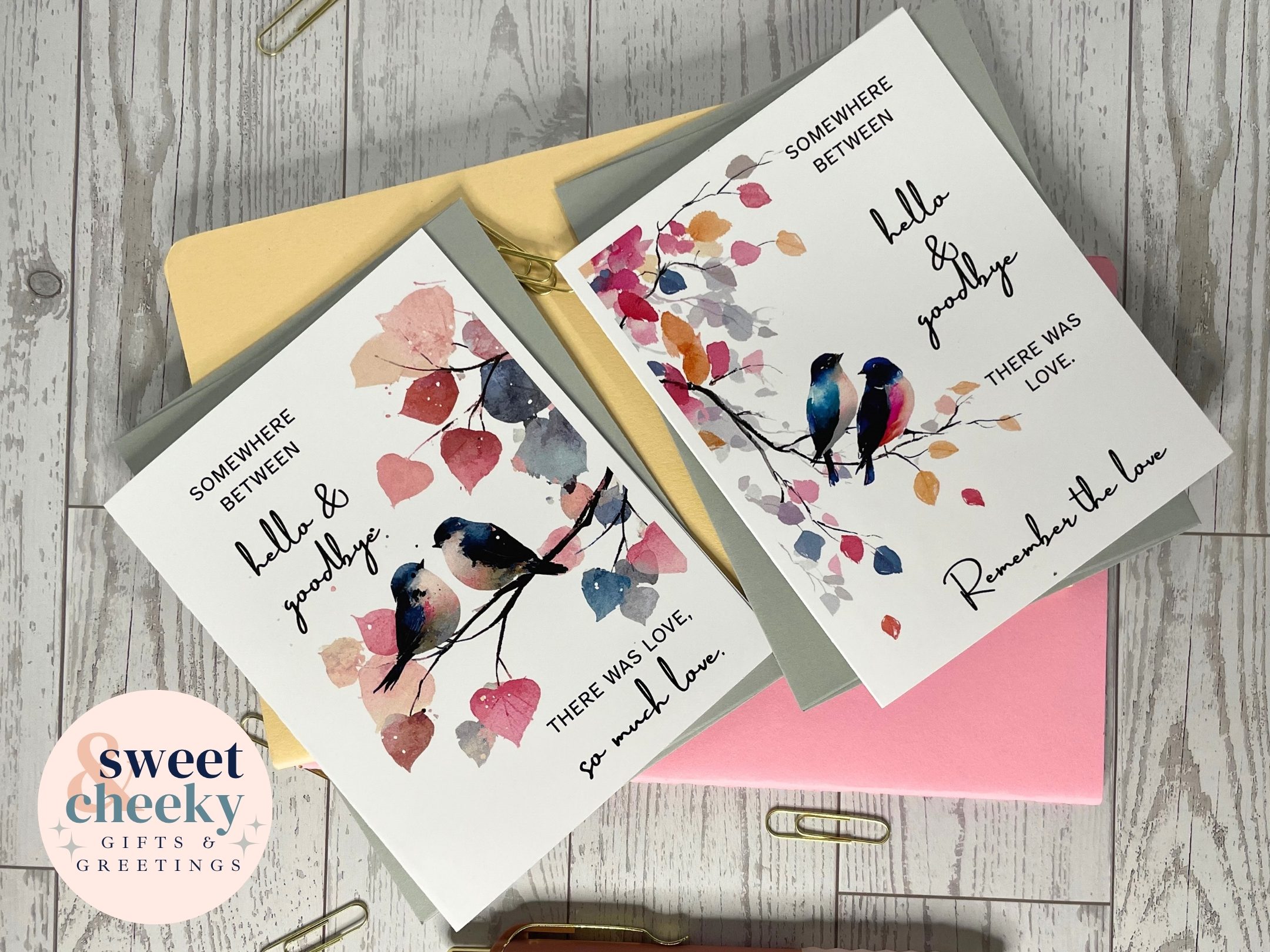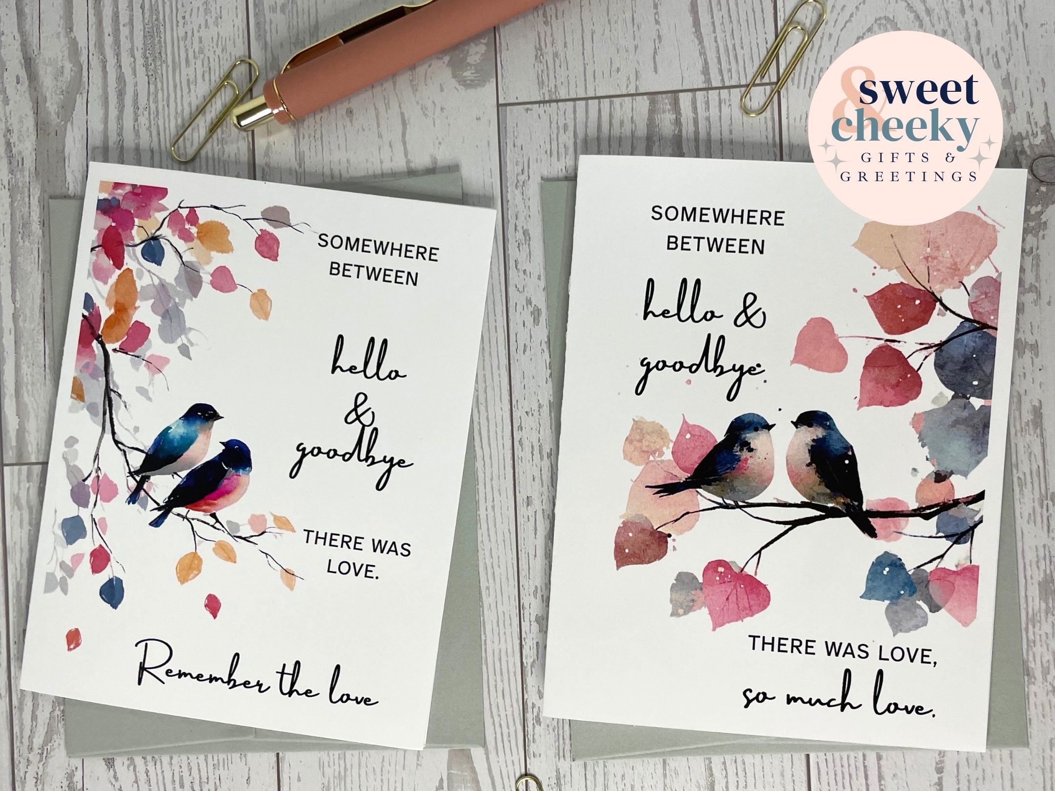 A gentle reminder that love never disappears—no matter how painful the goodbye. This sympathy card features a soft, watercolor-style illustration of two birds perched on a branch, accompanied by a heartfelt message: “Somewhere between hello and goodbye there was love, so much love.” Thoughtfully designed for times of loss, mourning, or remembrance, this card offers quiet comfort and emotional depth when words are hard to find.